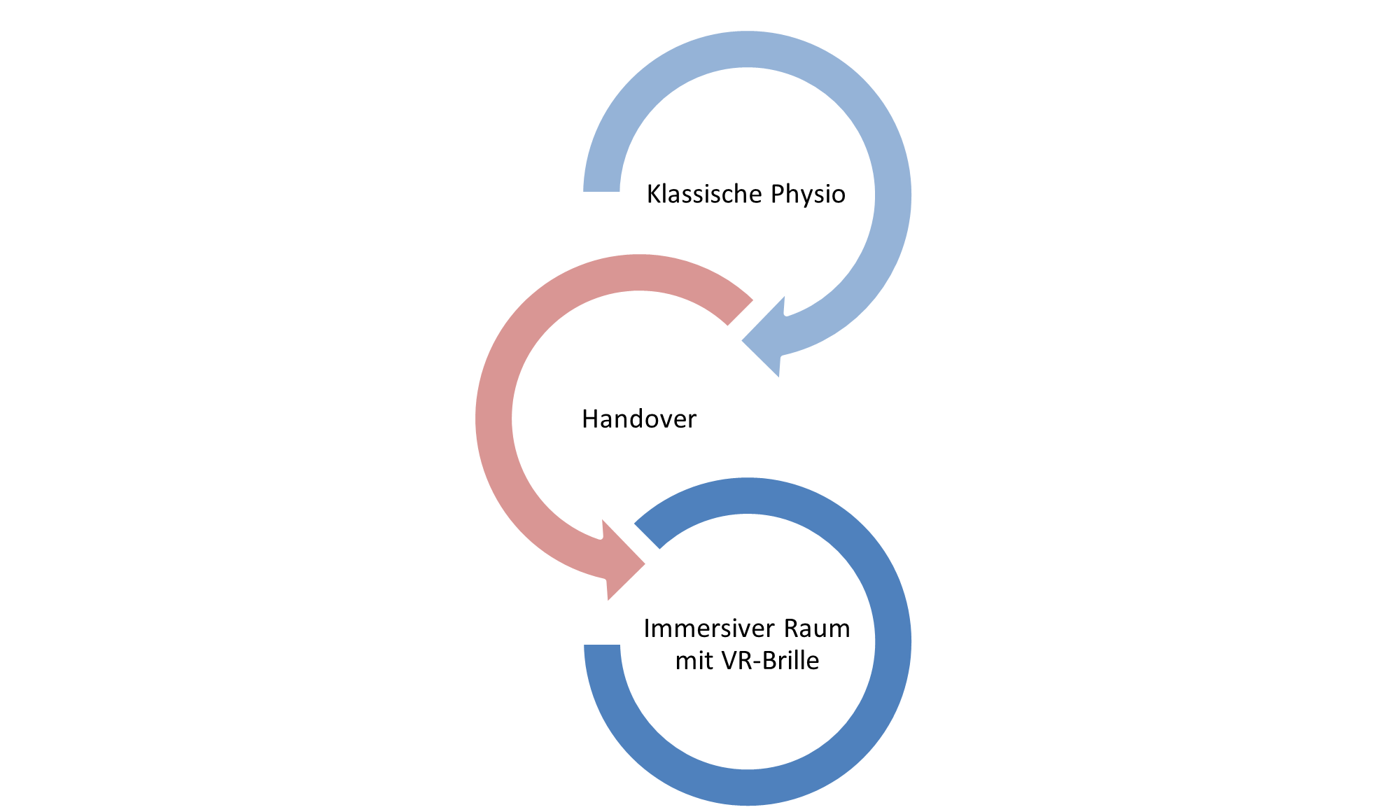 VR-Slot (00:30 – 01:00): Der Patient trainiert selbstständig im immersiven Raum («Beat & Move» oder ein auf den Patienten abgestimmtes Programm).